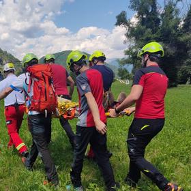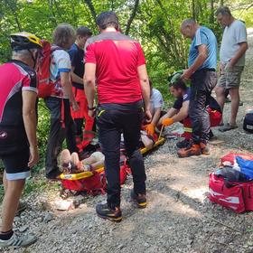 V četrtek, 15. 6. 2023, so nas okoli 13. ure poklicali iz Regijskega centra za obveščanje in obvestili o poškodbi kolesarja v bližini Gorenjega Loga. Pri spustu po kolovozu je 75-letni državljan Italije padel na glavo in se hudo telesno poškodoval. Ekipa Nujne medicinske pomoči iz Tolmina ga je na kraju oskrbela in pripravila na transport, gorski reševalci pa smo ga s kraja nesreče prenesli na bližnji travnik. Za hitrejši transport smo aktivirali dežurno ekipo GRS na Brniku in posadko helikopterja Slovenske vojske, ki je poskrbela, da je bil poškodovani kolesar kar najhitreje v bolnišnici.