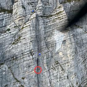 Po prihodu helikopter še “natanka” na Bovškem letališču in odleti proti Jerebici. Zbrani na heliportu v Bovcu vsi nestrpno čakamo informacije iz terena: “Bo pobral, ne bo pobral?”. A zadeva je po nekaj 10. minutah jasna. Zaradi izredno strme stene, nekaj sunkov vetra, s helikopterjem žal ne bo šlo. Že pred tem smo na kup zbrali vso potrebno opremo za stensko reševanje, ki je ni malo, saj je takšno reševanje eno izmed težjih. 7 statičnih vrvi, nekaj dinamičnih, vitla, vrtalka in še veliko dodatne opreme je potrebno za klasično stensko reševanje. Ekipa s helikopterja med prečesavanjem južne stene Jerebice naredi še nekaj fotografij, katere nam bodo prišle še kako prav pri dostopu do plezalcev. Nato nam sporočijo: “Prihajamo po vas”. Naveza je pod previsom in v strmi zajedi, približno 150 metrov pod vrhom smeri. Helikopter v dveh ciklih odpelje ekipo in vso potrebno opremo malo pod vrh Jerebice. Med poletom proti vrhu se mrači in vsem je jasno, da bo kmalu prevladala tema. V veliko veselje nam je, da je na kraju, kjer nas odloži helikopter še ena naveza, ki je pravkar zaključila plezanje točno te smeri, v kateri je obstal poškodovanec. “Zdravo, fanta! Najprej čestitke za splezano smer! Če pa nam lahko pomagata, bi bili zelo veseli”. Oba se spogledata, a brez težav prikimata: “Če je potrebno, pa bova! Zakaj pa ne!”. Skupaj nas je na terenu 7 reševalcev GRS Bovec in 2 alpinista, ki nam pomagata predvsem pri točnem lociranju smeri iz vrha navzdol. V trdi temi je iskanje prehodov še posebej zahtevno. A kaj je v tistem trenutku lepšega kot to, da ti prehode mimo ruševja in skalnih stebrov pokaže nekdo, ki je bil tam le uro nazaj.