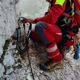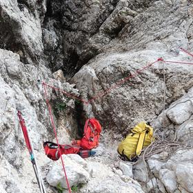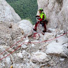 Ko je vse dogovorjeno, odletimo. Hitro lociramo ozko poličko, ki se kasneje razširi v udobno gredo, visečo navzdol in posuto s skalnim drobirjem. Helikopter SV žal ne more do razširitve police, zato nas posadka z natančnim manevrom odloži na droben skalni rob, kjer se takoj vpnemo v vrvno ograjo, ki smo jo postavili prejšnji dan. Kristjan in Janez takoj pričneta z delom: preverita celotno vrvno ograjo in začneta z izdelavo sidrišč, sam počakam in skušam pomagati še ostalim reševalcem, ki jih posadka z milimetrsko natančnostjo spušča na izpostavljeno mesto. Kmalu je vseh devet reševalcev pripravljenih za sklepni del reševanja.