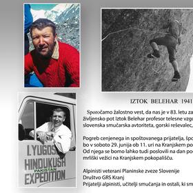 Sporočamo žalostno vest, da nas je v 83. letu zapustil in sklenil svojo življenjsko pot Iztok Belehar, profesor telesne vzgoje, alpinist, strokovna slovenska smučarska avtoriteta, gorski reševalec, atlet, košarkar.