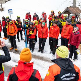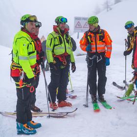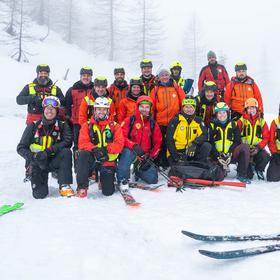 By 7 AM, local rescuers are already gathering in the parking lot in Kranjska Gora. We’re waiting for colleagues from Villach and Tarvisio to arrive, along with a unit from the financial police specialized in mountain rescue. In total, there are 65 of us—plus a few four-legged team members.