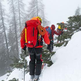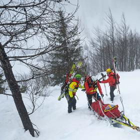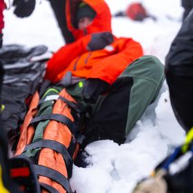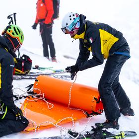 Finally, the team can deploy. The most eager rescuers set off first to provide medical care, while the rest of us follow at a slower pace, carrying the Tiral stretcher and ropes for the descent.