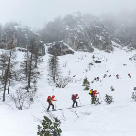 We reach the Austrian team, who are already treating the casualty. Our task is to move higher up. After about 20 minutes of ski touring, I arrive at the scene. Our team is already providing medical care, and two anchor points for the descent have been set up. We quickly assess the situation and the terrain for the stretcher relay. Due to the steep slope, even the team setting up the next two anchors (C and D) will need to descend on ropes.