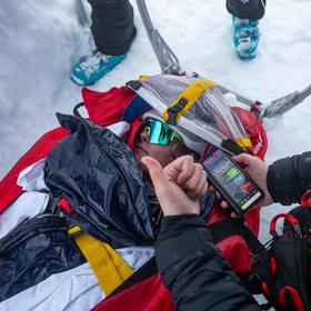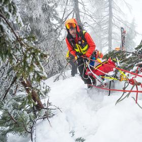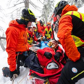 A doctor from Villach volunteers to accompany the casualty in the stretcher, wanting to stay close throughout the evacuation. She inserts an ear-worn monitor, which transmits real-time vitals via Bluetooth to her mobile phone. However, Bluetooth only works over short distances, meaning a less technical descent around the gully would disconnect the data feed. Since last year, we’ve also been using the Cosinuss° device in Slovenian mountain rescue.