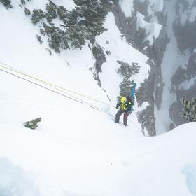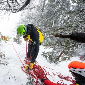 Fortunately, there’s some dense shrubbery above it, which proves to be an excellent alternative—especially since all our ice axes are still buried in the snow as active anchors. Once again, our team takes charge of setting up the next pair of anchors, as the rest of the rescuers are still further down. Improvisation, but in this case, the best solution.