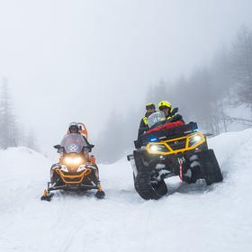 We hook up trailers loaded with snowmobiles and a tracked ATV—new additions to some mountain rescue teams, making it easier to transport gear and personnel up to the top of the pass.