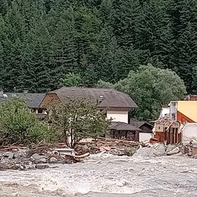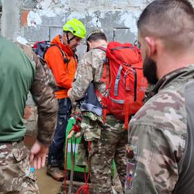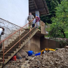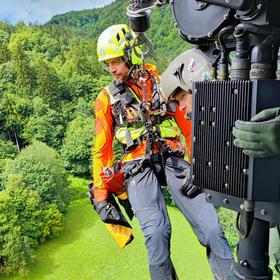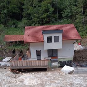 GRS Koroške pomaga na najbolj prizadetih mestih. V Črni na Koroškem so že zjutraj, kot smo poročali, s pomočjo dežurne ekipe za reševanje v gorah in helikopterja Letalske policijske enote rešili starejšo osebo, ki si je pri padcu v hiši zlomila kolk. Reševanje je onemogočala visoka voda okoli bloka, zato je na pomoč priskočil tudi eden od domačinov z bagrom, ki je reševalca letalca in ponesrečenca toliko dvignil, da ga je bilo možno povitlati v helikopter.